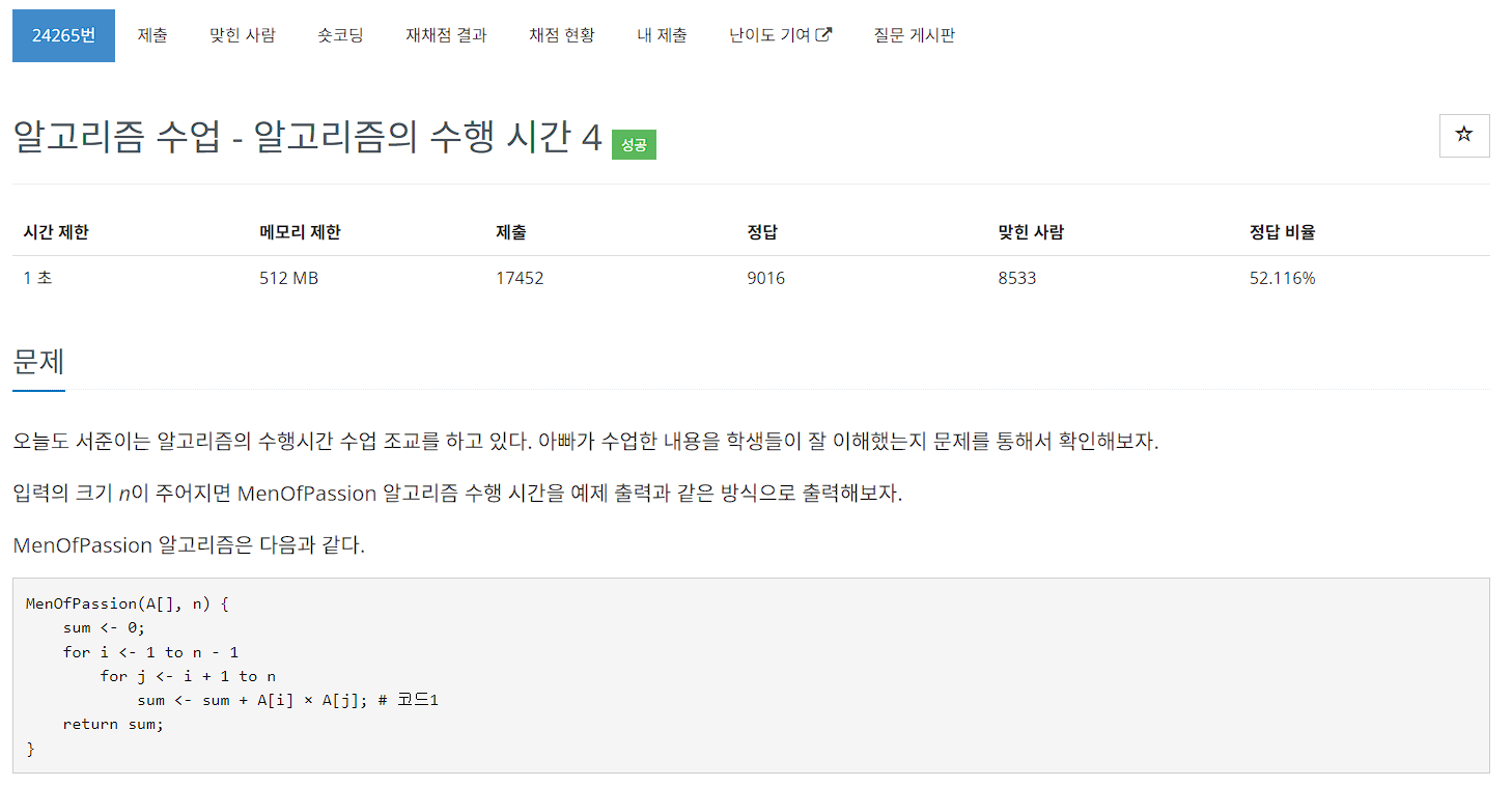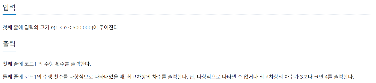 languages/coding test [백준/Python] 24265번: 알고리즘 수업 - 알고리즘의 수행 시간 4 - 단계별로 풀어보기 > 단계 11: 시간 복잡도 > 242645번 #24265: 알고리즘 수업 - 알고리즘의 수행 시간 4 n = int(input()) sum = 0 for i in range(n): sum = sum + i print(sum) print(2) #다른 방법 print(n*(n-1)//2) print(2) 문제의 반복문을 봅시다. 이중 반복문이 첫 번째 반복문의 영향을 빋아, n-1부터 1까지 반복합니다. 따라서 for문으로 합산을 구해도 되고, 등차수열의 합으로 계산해도 됩니다. 식이 $n(n-1)/2$이므로 최고차항의 차수는 2가 됩니다. 공유하기 게시글 관리 익명의 일지 'languages > coding test' 카테고리의 다른 글 [백준/Python] 24267번: 알고리즘 수업 - 알고리즘의 수행 시간 6 (1) 2024.02.21 [백준/Python] 24266번: 알고리즘 수업 - 알고리즘의 수행 시간 5 (0) 2024.02.20 [백준/Python] 24264번: 알고리즘 수업 - 알고리즘의 수행 시간 3 (1) 2024.02.17 [백준/Python] 24263번: 알고리즘 수업 - 알고리즘의 수행 시간 2 (0) 2024.02.17 [백준/Python] 24262번: 알고리즘 수업 - 알고리즘의 수행 시간 1 (1) 2024.02.17 Contents 당신이 좋아할만한 콘텐츠 [백준/Python] 24267번: 알고리즘 수업 - 알고리즘의 수행 시간 6 2024.02.21 [백준/Python] 24266번: 알고리즘 수업 - 알고리즘의 수행 시간 5 2024.02.20 [백준/Python] 24264번: 알고리즘 수업 - 알고리즘의 수행 시간 3 2024.02.17 [백준/Python] 24263번: 알고리즘 수업 - 알고리즘의 수행 시간 2 2024.02.17 댓글 0 + 이전 댓글 더보기